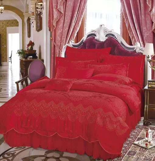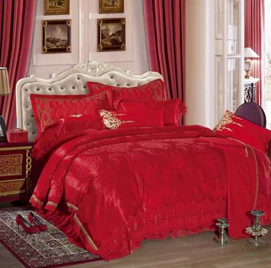 本产品面料采用60s仿丝棉独特定制大版图案、喜庆的大红色、灿烂的宝石、精致的欧式建筑卷草花纹,无处不衬出对爱情的幻想渴望。大片手工订制珍珠和卷草绣花结合,共同组成了梦幻婚礼的完美见证。